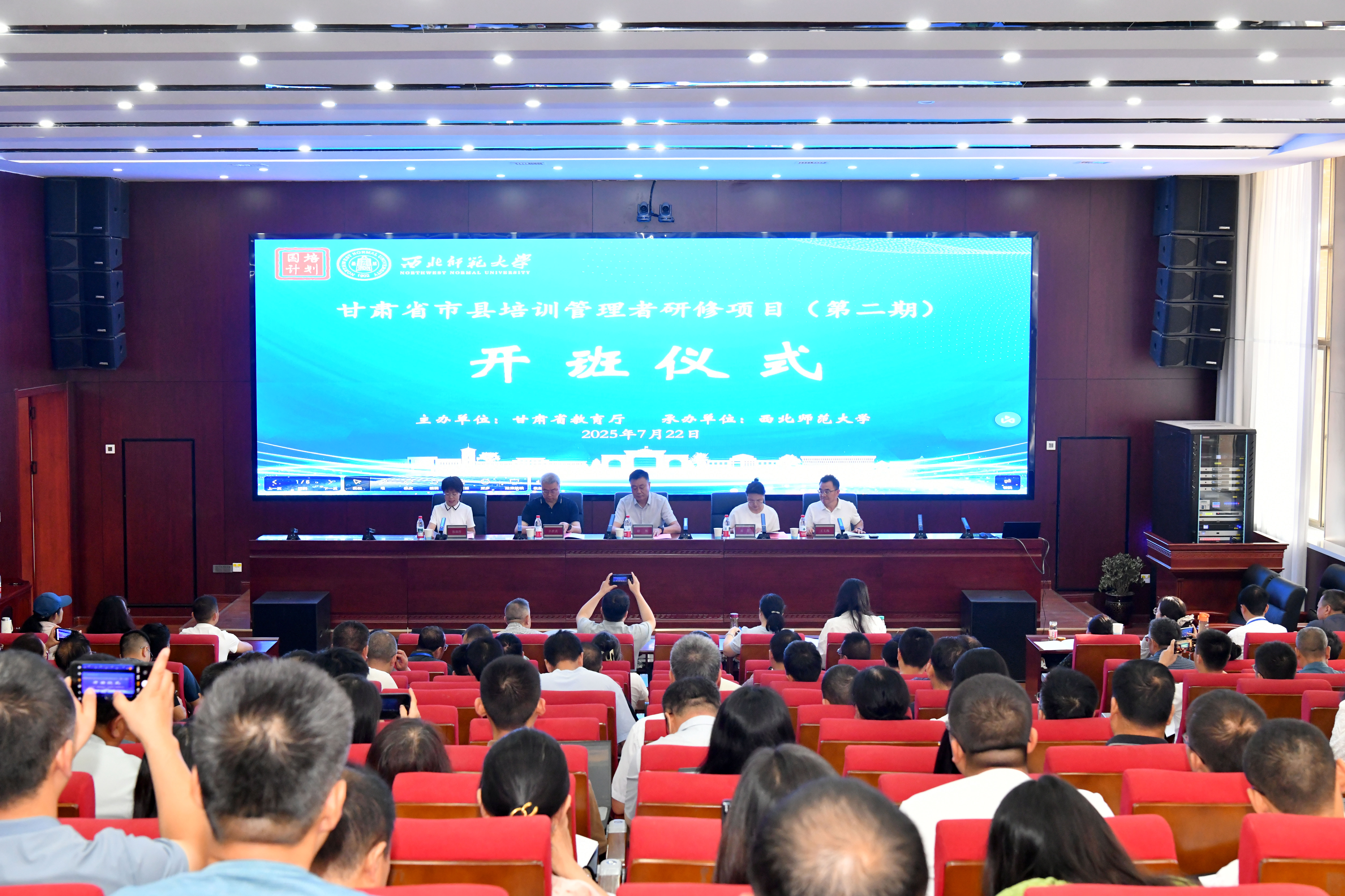 2025年7月22日上午,甘肃省市县培训管理者研修项目(第二期)在西北师范大学正式开班。开班仪式在西北师范大学知行校区举行,继续教育学院院长赵辉、甘肃省教师发展中心常务副主任王文槐、甘肃省国培计划项目办公室主任刘慧、教师教育学院教授吕世虎出席了仪式。来自甘肃省各市(州)、县(区)教育局及2025年整县提升项目县和承训院校的培训管理者共177人参加了开班仪式。仪式由继续教育学院副院长郭莉萍主持。