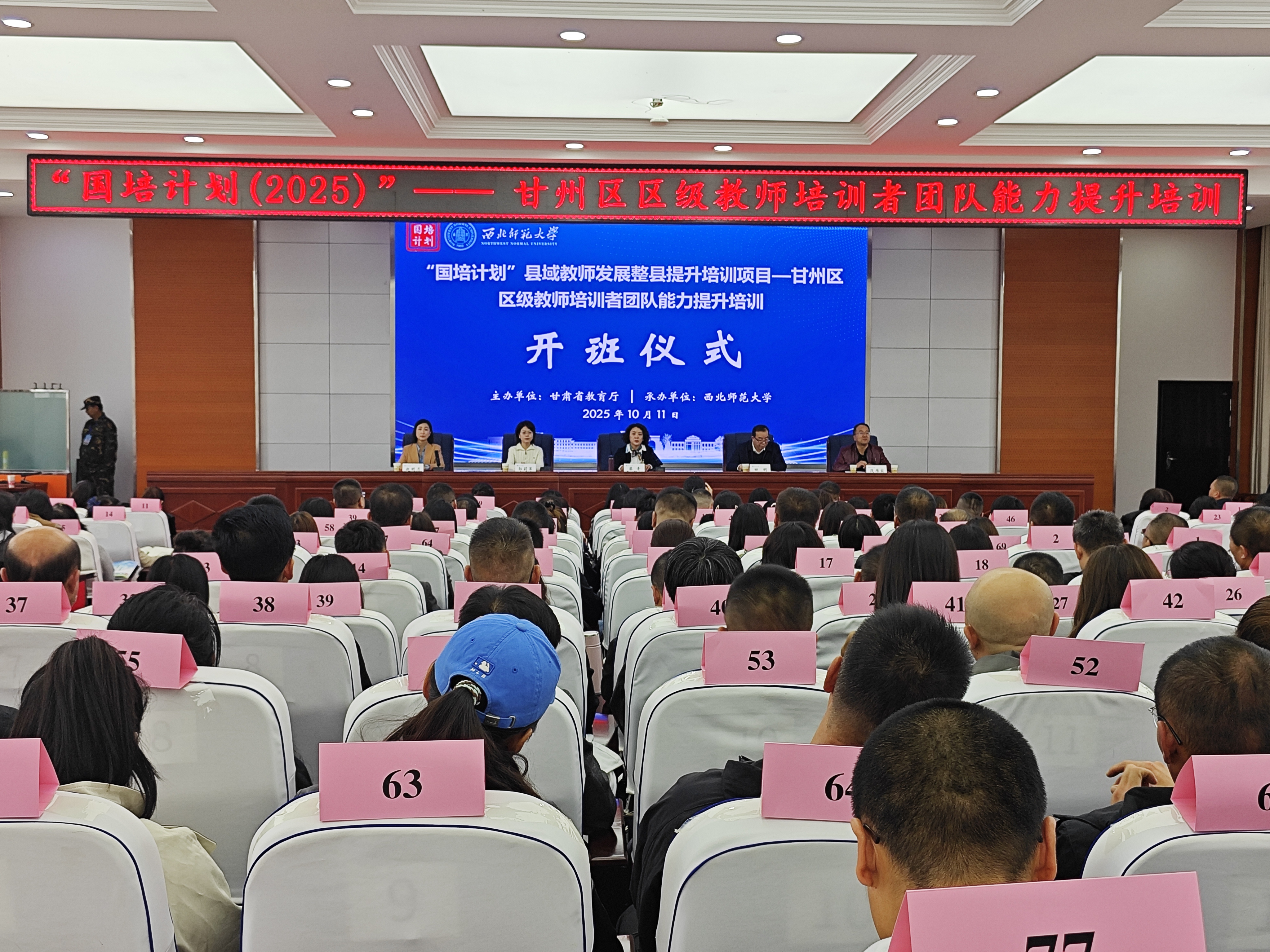 2025年10月11日下午,“国培计划”县域教师发展整县提升培训项目—甘州区区级教师培训者团队能力提升培训开班仪式在张掖市综合实践学校举办。甘州区教育局党组书记、区委教育工委书记、局长蔡青,西北师范大学继续教育学院副院长郭莉萍出席开班仪式并讲话。甘州区教育局党组成员、区教育考试中心主任田明,区教育局教学研究室主任段雁宾,甘州区151位区级教师培训团队成员以及相关工作人员参加开班仪式。
