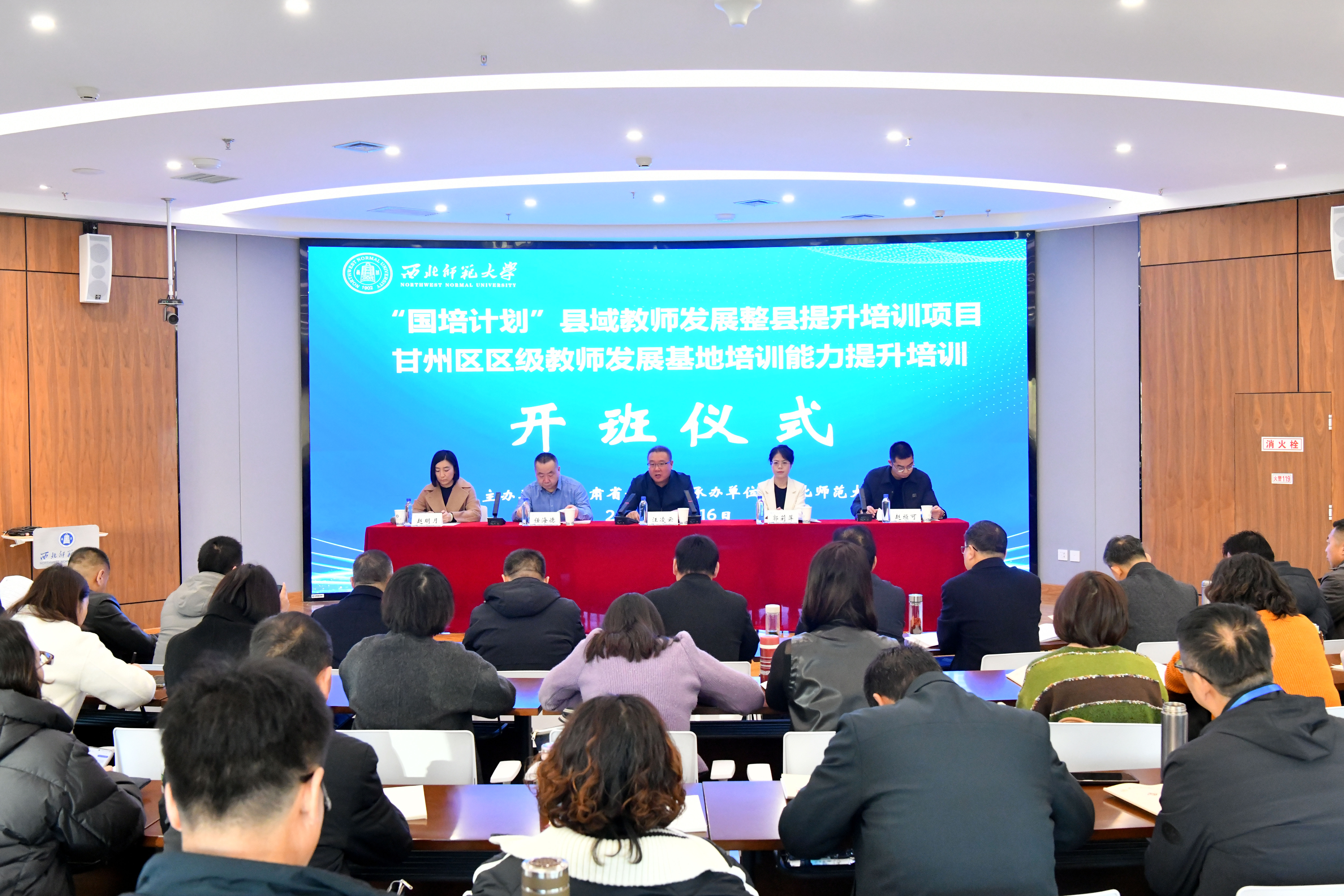 2025年11月16日上午,“国培计划(2025)”县域教师发展整县提升培训项目——甘州区区级教师发展基地培训能力提升培训在西北师范大学开班。甘州区教育局党组成员、区委教育工委副书记汪凌云,甘州区教育局教育股负责人任海德,继续教育学院副院长郭莉萍,教育科学学院副教授、项目学科负责人赵垣可出席仪式并讲话,来自甘州区23个“学科薪火研训基地”和教育集团牵头校的48位管理骨干参加开班仪式,开班仪式由继续教育学院培训中心教师主持。
