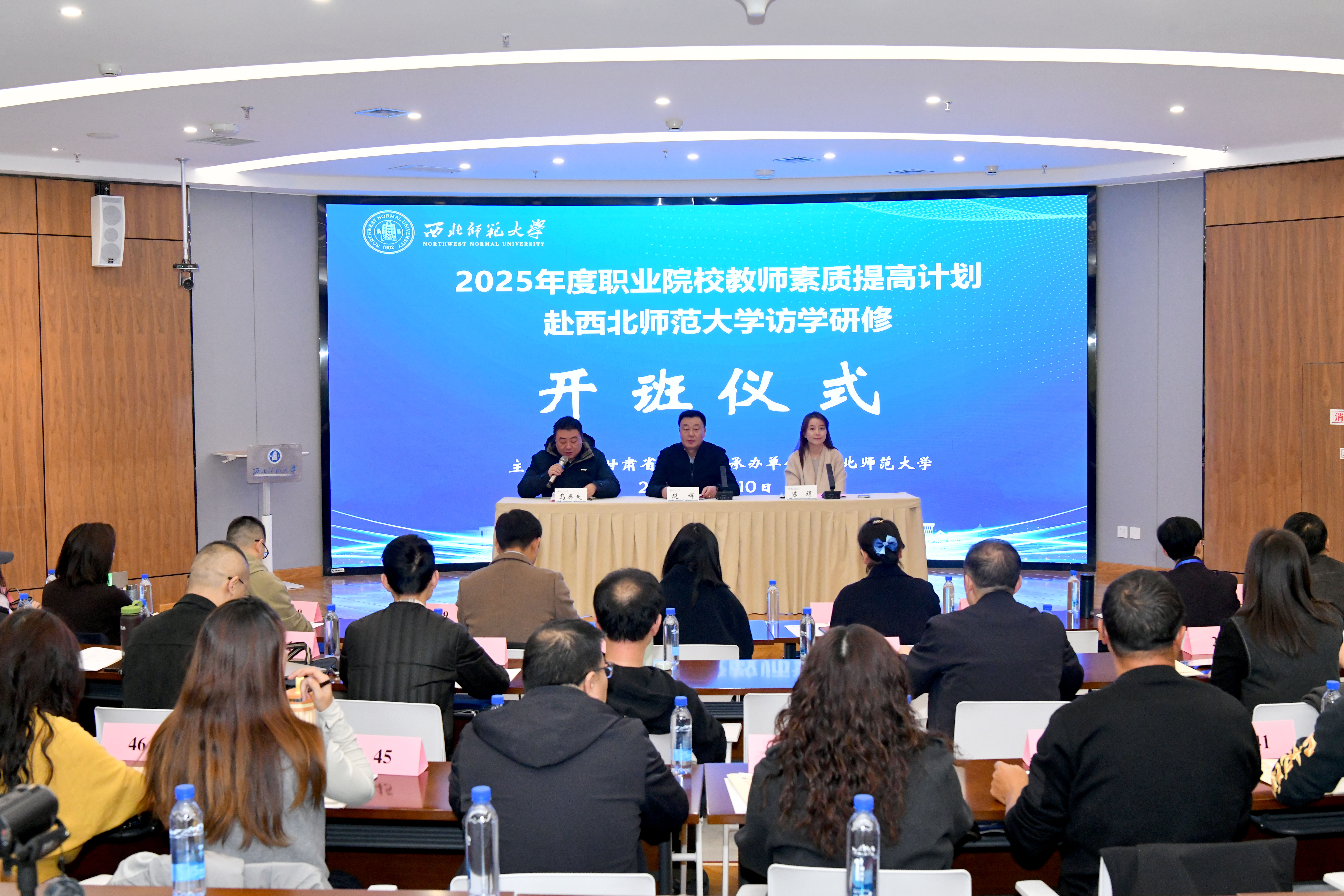 2025年11月10日上午,2025年度职业院校教师素质提高计划赴西北师范大学访学研修项目开班。继续教育学院院长赵辉,教育科学学院、项目学科负责人陈娟出席开班仪式并讲话,来自全省的50名职业院校教师参加开班仪式。仪式由继续教育学院师资培训中心教师乌恩夫主持。